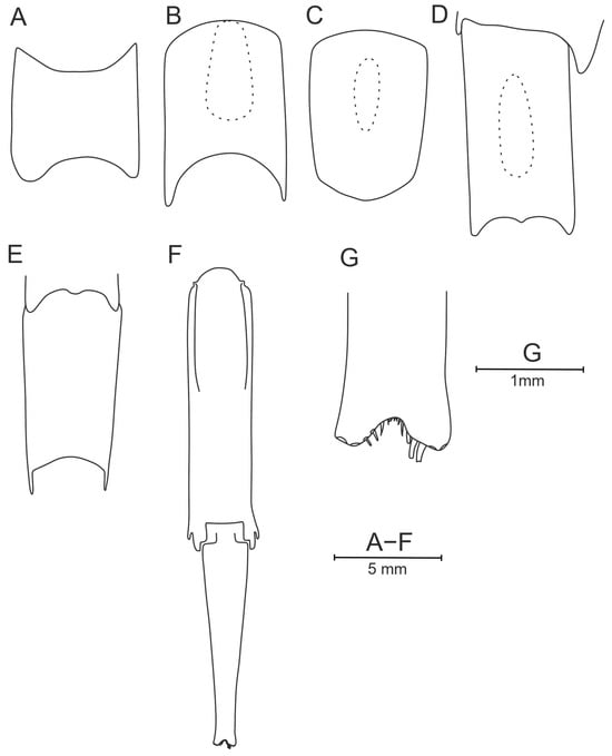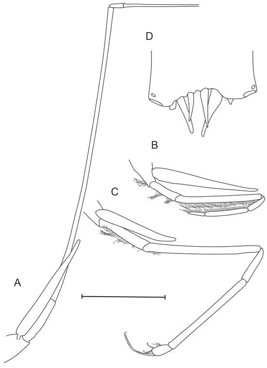 All pleonic somites (Figure 8) without posterodorsal teeth, sixth somite posterodorsal protrusion 0.31 times as long as wide and resembling posterodorsal tooth from lateral view. First somite dorsally rounded along entire length; second to fifth somites dorsally depressed in posterior 0.6–1.0, 0.75–1.0, 0.35–0.80, and 0.5–1.0 parts of their length, respectively; sixth somite dorsally carinate in anterior 2/3 part, depressed in posterior 1/3 part and laterally carinate in anterior 0–0.5 part. Telson 0.76–0.78 times as long as sixth pleonic somite, with well-marked dorsal groove along its entire length. Telson end almost straight laterally and slight medial depression 0.10 times as deep as wide, armed with four pairs of terminal robust setae, and single pair of subterminal lateral dorsal setae (broken—Figure 11D).