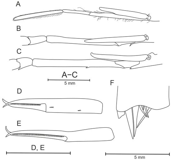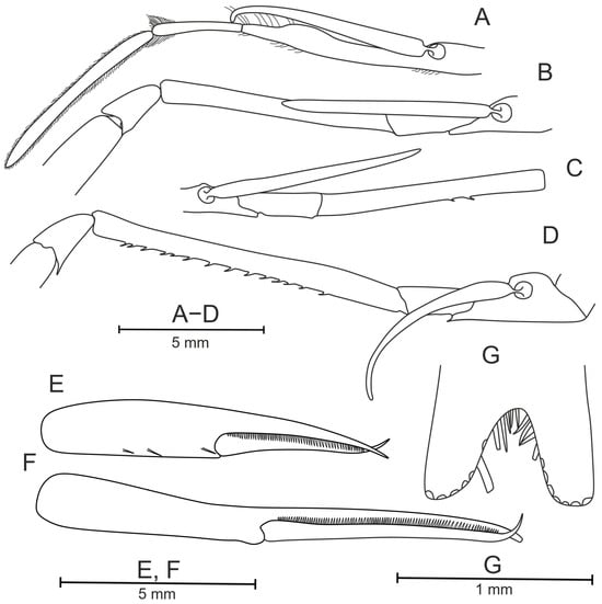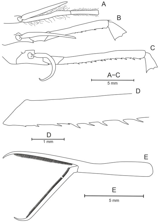 First pereopod (Figure 10B) extending beyond scaphocerite by about 0.4 times length of palm. Basis with single very long ventrally directed distal tooth. Merus with 15–16 teeth evenly distributed along entire length of segment. Carpus short, with large teeth on dorsal and ventral parts of distal margins. Chela with two ventral bristles on propodus, fingers 0.71–0.75 times as long as palm (Figure 10D).