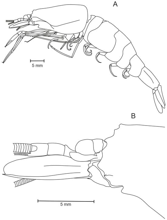 - Stebbing, T.R.R. Stalk-eyed Crustacea Malacostraca of the Scottish National Antarctic Expedition. Trans. R. Soc. Edinb. 1914, 50, 253–307. [Google Scholar] [CrossRef]