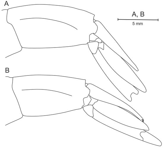 - Chelae (of pereopods I and II) (Figure 2C,D): Length of the fingers, length of the palm, maximum height of the palm.