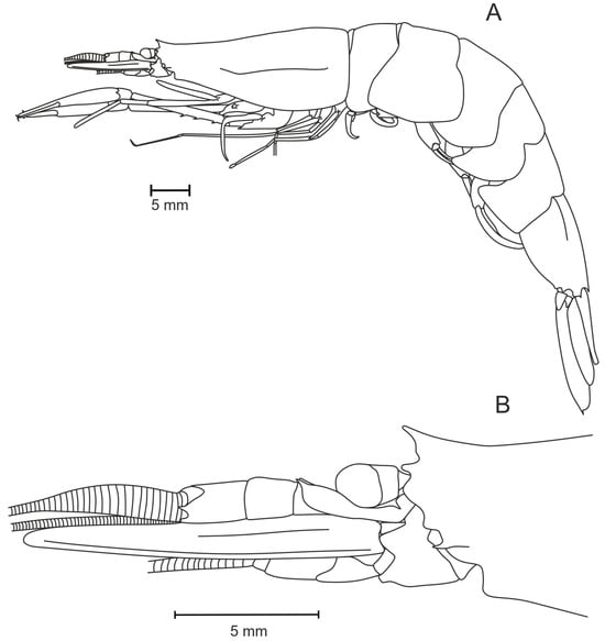 - Vereshchaka, A.L.; Lunina, A.A.; Kulagin, D.N.; Olesen, J.; Corbari, L. Revision of the global fauna of Leptochela Stimpson, 1860 (Crustacea: Decapoda), highlighting phylogenetic clades and a new species. Diversity 2024, 16, 760. [Google Scholar] [CrossRef]