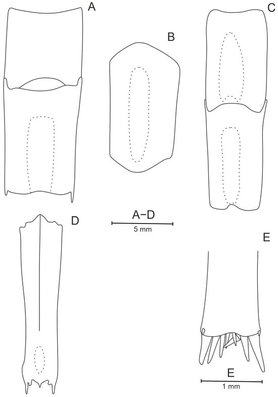Pasiphaea allainae sp. nov., holotype, ovigerous female (WAL09−M195−200) CL 25.6 mm—pleonic somites. (A) First and second somites. (B) third somite. (C) fourth somite. (D) fifth somite. (E) sixth somite.