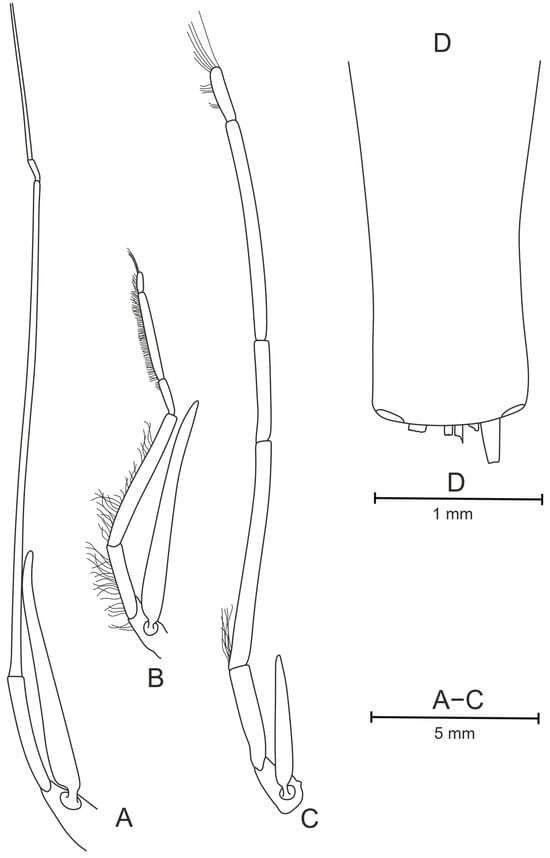 Pasiphaea allainae sp. nov., holotype, ovigerous female (WAL09-M195-200) CL 25.6 mm. (A) Right pereopod III, lateral view; (B) right pereopod IV, lateral view; (C) right pereopod V, lateral view; (D) telson end, dorsal view. Scale bar: 5 mm for (A–C), 1 mm for (D).