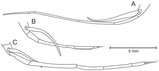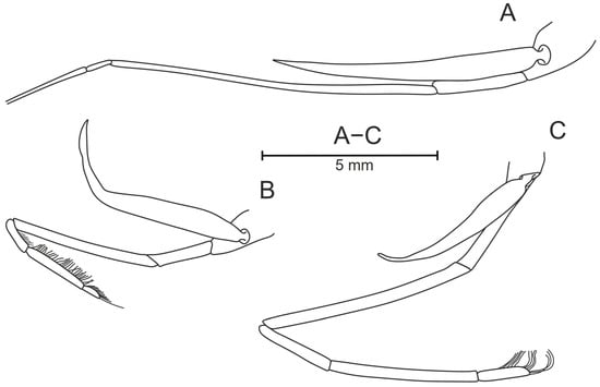 Third pereopod (Figure 11A) slender, extending beyond anterior margin of carapace by last two segments; not bearing teeth on any segment. Fourth pereopod (Figure 11B) shortest, bearing dense brush of short bristles on each segment including distal part of basis; teeth absent on all segments. Fifth pereopod (Figure 11C) longer than fourth, bearing bristles only on basis and dactylus, latter rounded and bearing longer bristles; teeth absent on all segments.
