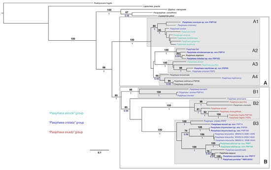The phylogenetic tree retrieved for these and other available Pasiphaea species shows that the genus comprises two robust major clades (A and B), each including four new species (Figure 39, Supplementary Figures S1 and S2). Clade A is further divided into three well-supported subclades (A1–A3) including eight, four, and four species, respectively, and one partly supported (on the BI tree only) subclade (A4) with three species. Clade B is divided into three supported subclades (B1–B3) including two, five, and eight species, respectively, plus an isolated clade containing P. americana. The clades B2, B3, and P. americana also formed a robust clade.