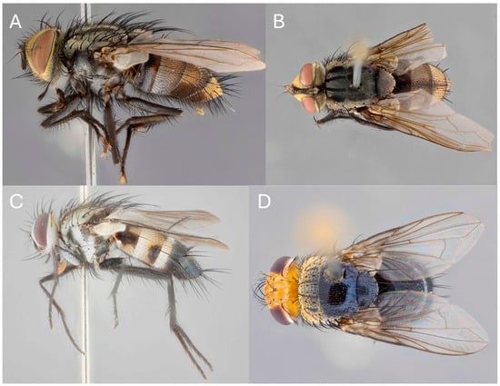 Tachinids comprise exclusively koinobiont parasitoids of other arthropods, predominantly of insects. They are also one of the most species-rich families in the Diptera with more than 10,000 described species [10] in over 1000 genera, 76% of these being from the Neotropics [11]. Many species are difficult to identify morphologically [12]. The great majority of tachinid species are parasitoids of exophagous, leaf-eating (not-leaf- or stem-mining) caterpillars especially when it comes to members of the two largest tachinid subfamilies, Exoristinae (Figure 1A) and Tachininae (Figure 1D), although exophagous leaf-eaters are also hosts of quite a few species of Dexiinae (Figure 1B,C) many species of the latter are parasitoids of Coleoptera larvae. It is worth noting that the systematic placements of some genera have not been stable [13] and here we follow the recent multi-gene molecular phylogeny [14] and checklist of world Tachinidae [11].