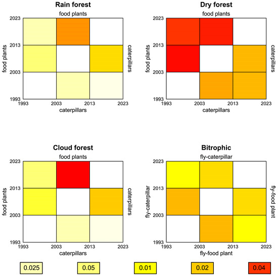 We also calculated these indices separately for each five-year time period and ecosystem, and the results are provided in Table S2. Overall, both generality and linkage density were highest in the rain forest and lowest in the cloud forest. However, it should be noted that the reliability of the values might be reduced because of the incompleteness of the samples, with many species represented by only a few individuals (singletons and doubletons) [36].