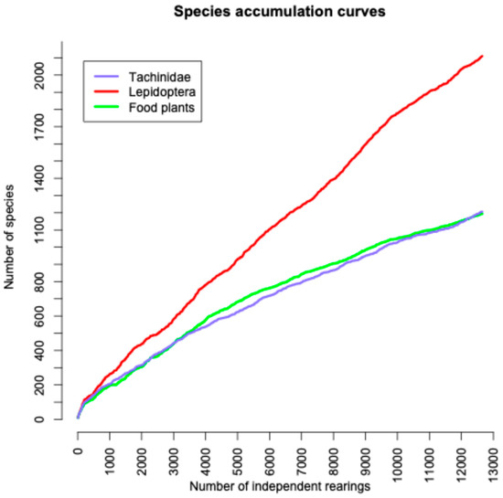 Species accumulation of parasitoids, hosts and food plants with rearing effort (number of independent rearings through time).
