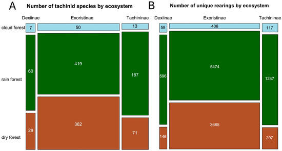 Figure 6A shows the relative numbers of species of the three tachinid subfamilies from each of the three ecosystems, and Figure 6B shows the relative numbers of independent rearings by ecosystem. The widths of the rectangles indicate the relative numbers of species in each subfamily. Overall, the relative numbers of rearings of each subfamily in each habitat mirrored the numbers of species found there. Both Dexiinae and Tachininae were relatively better represented in cloud and rain forests compared to Exoristinae, which show a preference for dry forest habitat.