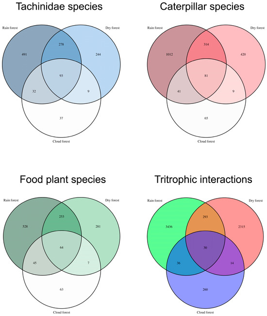 Species overlap for tachinids, caterpillars and food plants between habitats is fairly low (Figure 7). As explained by Quicke et al. [86] the three ecosystems do intergrade, and there are similar plants along some of the trails in each ecosystem that are associated with recently disturbed habitats (ruderal species). For food plants, 5.1% of the species were found in all three habitats; approximately the same (4.1%) was found for caterpillars, and slightly more for tachinids (7.8%). Of the total tritrophic interactions, fewer than 0.5% were common to all three habitats.