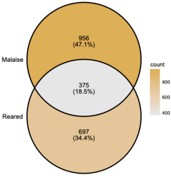 Venn diagram comparing the diversity of tachinid flies that have been documented in ACG via rearing and those collected in ongoing Malaise trapping. The data only include barcoded specimens, and the counts refer to the number of BINS.
