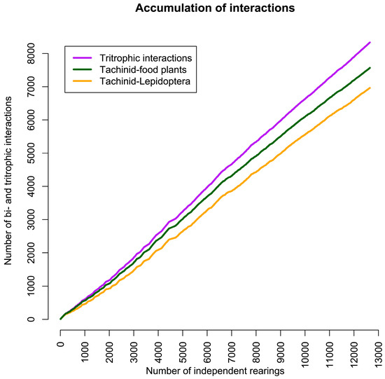 The numbers of observed bi- and tritrophic interactions for each tachinid subfamily are summarised in Table 3, and the accumulation of interactions over time (rearing effort) is shown in Figure 10. Up until the end of 2023, a total of over 8300 tritrophic interactions have been suggested, but the virtually straight-line interaction accumulation curves suggest that this is only a small part of the total that occur. Applying Chao1 to the interactions suggests that the inventory of host associations is very far from complete. The overall observed number of tritrophic interactions was a little over 8000 (Table 3), but Chao1 gives an estimate of 49,454, i.e., 5.94 times larger, and for fly–caterpillar bitrophic interactions the multiplier is 5.88. Tachinid–plant bitrophic interactions are only a little more complete (multiplier = 4.34).