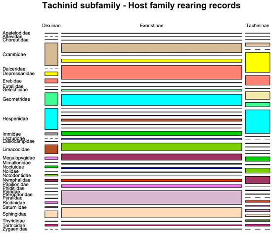 Mosaic plot showing relative numbers of associations of tachinid subfamilies with caterpillar families. Only Lepidoptera families with 30 or more unique host–parasitoid associations are shown. Colour scheme is as in Figure 10.