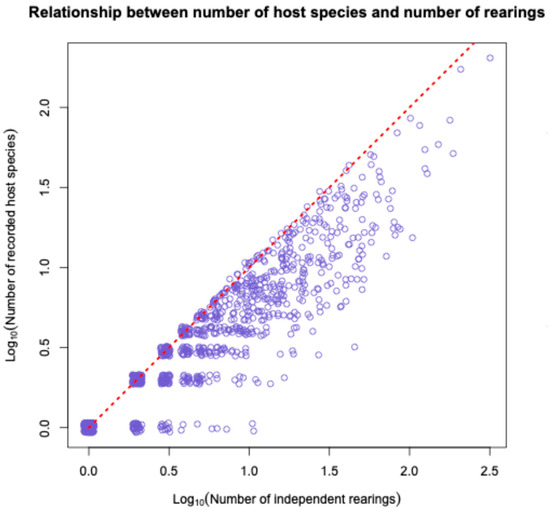 Relationship between the number of host species for each tachinid species versus the number of independent rearings. Data are presented on a logarithmic scale with points jittered to improve clarity. The broken red line indicates those species with maximum host range would lie, i.e., each independent rearing was from a different host species.