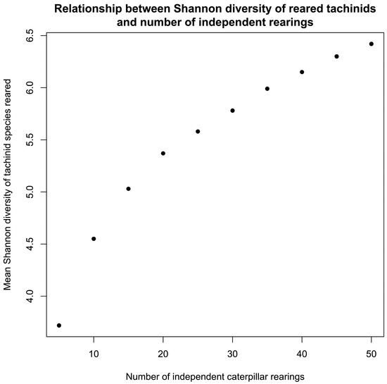 The number of host species recorded for each tachinid species was strongly correlated with the number of rearings of the tachinid species (Figure 14). The linearity of the number of host associations with the number of rearings (see Figure 10) shows that it is practically impossible to know the full range of interactions either for the tachinid parasitoid species or for most given host species. Therefore, we investigated the relationship between number of rearings of a host caterpillar species and the Shannon diversity of the tachinid parasitoids recovered [41] (Figure 15). Although the curve is progressively shallowing it has not plateaued even for host species that have been reared 50 separate times.