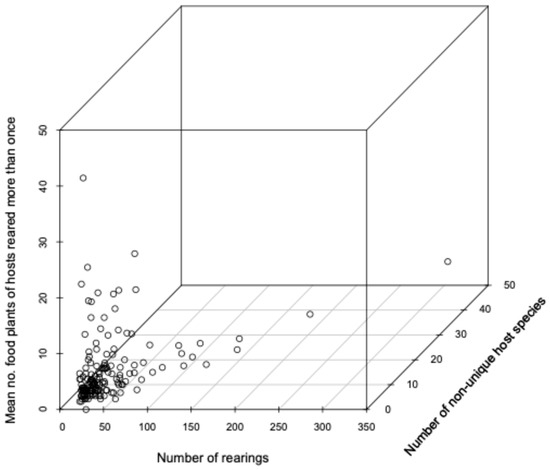 Three-dimensional perspective scatter plot of food plant range of host species (y-axis) in the whole ACG dataset in relation to number of rearings (x-axis) and number of host species (excluding unique host associations) (z-axis) for tachinid species that were reared on at least 20 independent occasions.