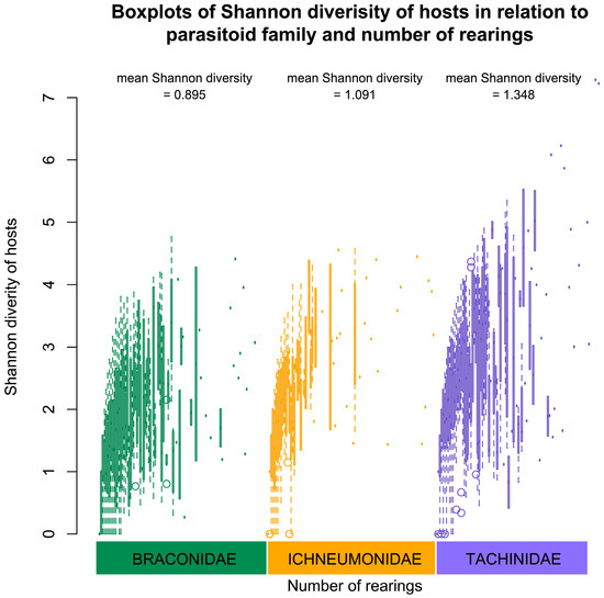 Relationship of Shannon diversity index of tachinid species richness and number of independent rearings of a host species.