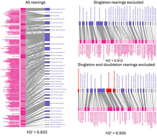 Data analyses were performed using the R environment for statistical computing [77]. In addition to functions available in base R, we used the packages bipartite [78], pals [79], and scatterplot3d [80]. Food web statistics calculated were connectance, rescaled connectance, linkage density, and generality [78,81,82,83]. Total numbers of species of braconids and ichneumonids in the study area were estimated using Chao1 [84]. Tachinid species richness (TSR) of hosts is presented both as numbers of tachinid associations with a given host and, since the full TSR cannot be ascertained with certainty, also as the Shannon–Wiener diversity statistic [40]. To evaluate the degree to which the tachinids of ACG might be declining [66], we present the total number of tachinids from the two most abundant subfamilies reared between 1989 and 2003. For this comparison, we orient the graph around the year 2005, when the total number of searching parataxonomists stabilised. To evaluate the host specialisation for ACG Tachinidae, we visualised as an example the species of the tachinid genus Belvosia and their hosts using the bipartite package [78] including all records, and to aid in visualisation, also excluding singleton and doubleton host records from the analysis. To assess the degree of community partitioning across forest ecosystems we used nonmetric multidimensional scaling (NMDS) in the vegan package [85] in R on Belvosia records. Some analyses additionally incorporated data on ACG host diet breadth from Quicke et al. [86] available from https://doi.org/10.5683/SP3/NX043G (accessed on 14 August 2025) and in the online Supplementary Materials of that paper.