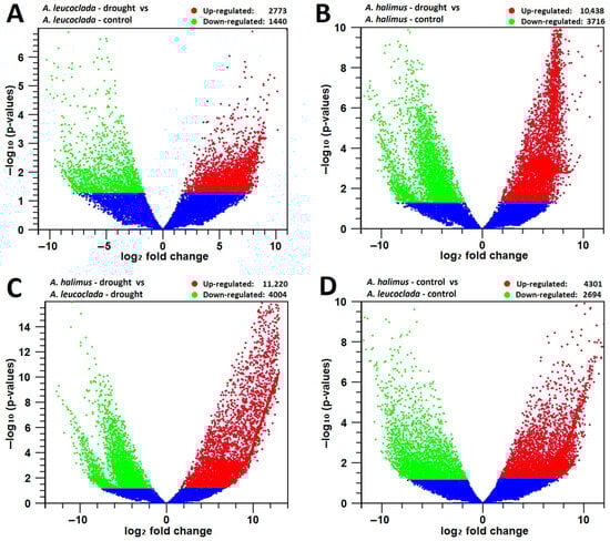 Global analysis of differentially expressed genes (DEGs) with fold change ≥ 2 in transcriptome. (A) Volcano plot of DEGs for A. leucoclada (drought) and A. leucoclada (control). (B) Volcano plot of DEGs for A. halimus (drought) and A. halimus (control). (C) Volcano plot of DEGs for A. halimus (drought) and A. leucoclada (drought). (D) Volcano plot of DEGs for A. halimus (control) and A. leucoclada (control). The abscissa shows the fold change difference in the expression of genes in different comparison groups, and the vertical coordinates indicate the adjusted p-values for the differences in expression. Genes without significant differences (p value ≤ 0.05) are indicated by blue dots below the threshold value (1.3). The up-regulated genes are represented by red dots, and the down-regulated genes are represented by green dots.