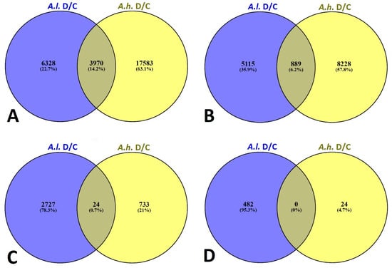 Venn diagrams showing the overlap of differentially expressed genes (DEGs) between Atriplex leucoclada (A.l.) and Atriplex halimus (A.h.) under drought stress relative to the control (D/C). Four thresholds of fold-change are shown: (A) ≥2-fold, (B) ≥4-fold, (C) ≥6-fold, and (D) ≥8-fold. Numbers inside circles: the count of DEGs unique to each species or shared between species. Numbers in parentheses: percentage of DEGs relative to the total DEGs in each species. Intersection (overlap) area: DEGs that are common to both species at the indicated fold-change threshold.