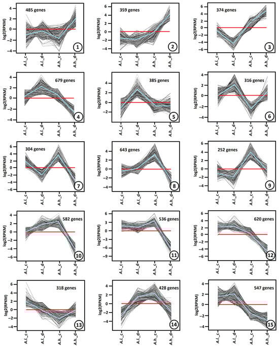 Several thousand DEGs during drought stress showed significant up-regulation or down-regulation (p-value < 0.01, fold change > 2 or <0.5). On the basis of similar kinetic patterns of expression, all DEGs were classified into unique gene expression patterns (clusters) (Figure 4). In our dataset, the optimal number of distinct expression profiles produced by the algorithm was 15. Even if some patterns appear visually close (such as clusters 11 and 12), their underlying expression values differ sufficiently for the algorithm to classify them as unique groups.