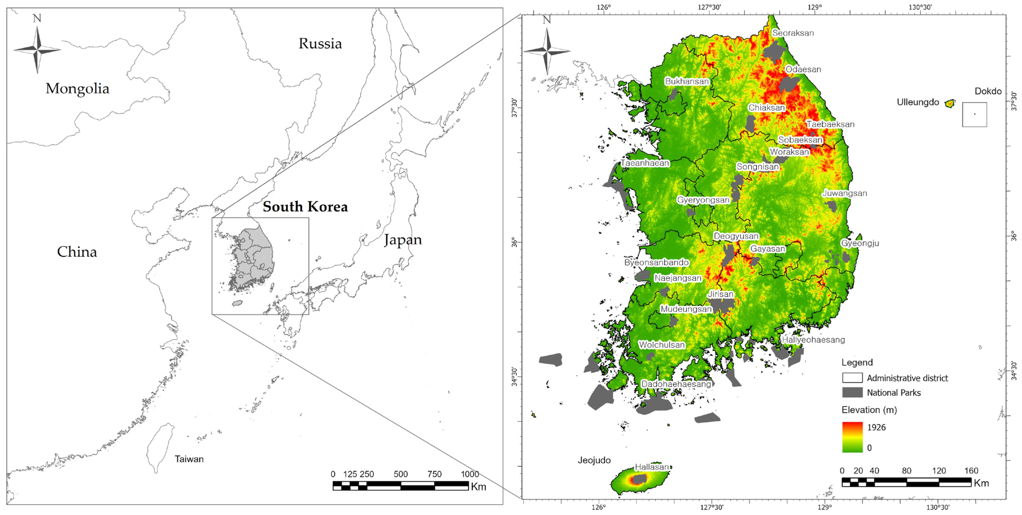 - Lee, S.W.; Lee, M.B. Analysis of the landscape ecological changes of mountains in Seoul Metropolitan Area. J. Korean Inst. Landsc. Archit. 2014, 42, 1–13. [Google Scholar]