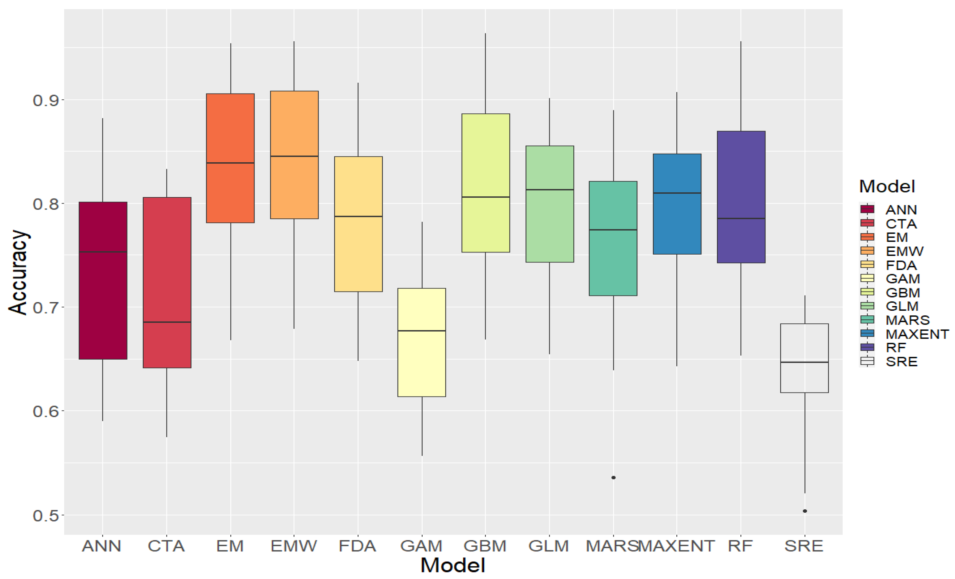 - Guisan, A.; Thuiller, W.; Zimmermann, N.E. Habitat Suitability and Distribution Models: With Applications in R; Cambridge University Press: Cambridge, UK, 2017. [Google Scholar]