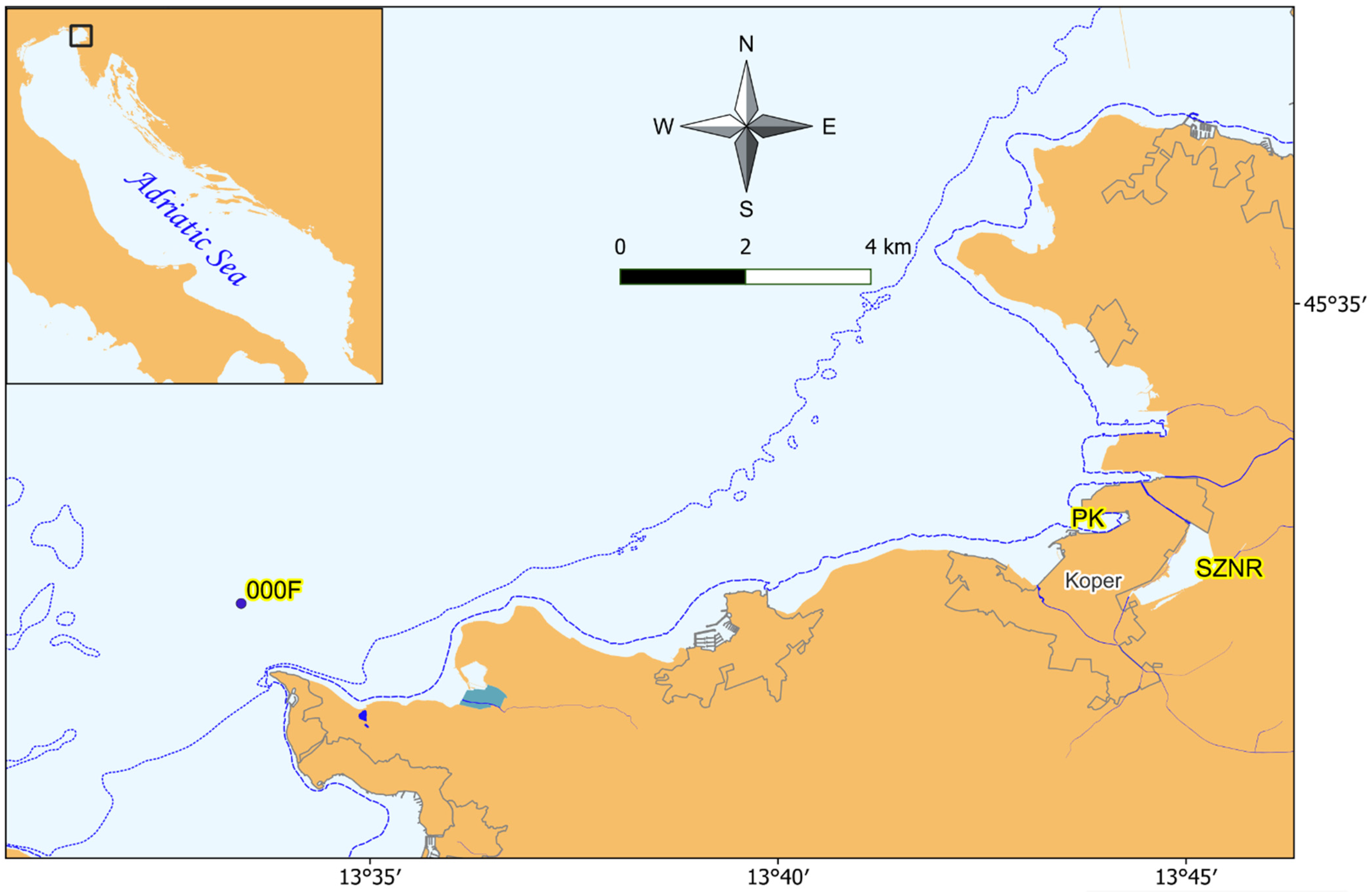 - Cerino, F.; Fornasaro, D.; Kralj, M.; Giani, M.; Cabrini, M. Phytoplankton temporal dynamics in the coastal waters of the north-eastern Adriatic Sea (Mediterranean Sea) from 2010 to 2017. Nat. Conserv. 2019, 34, 343–372. [Google Scholar] [CrossRef]