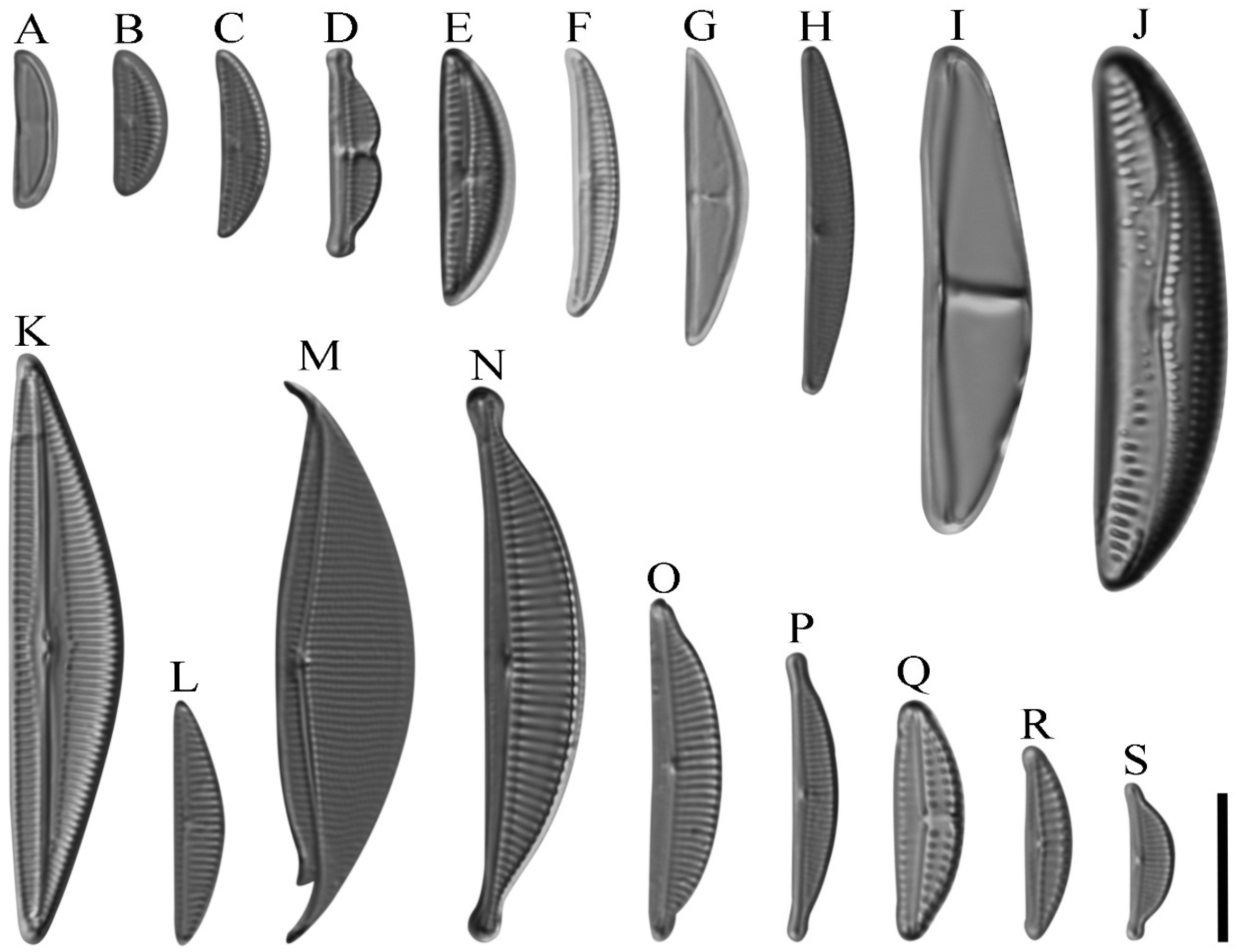 Figure 6. (A) Catenula adhaerens; (B) Amphora eximia; (C) Amphora cf. marina; (D) Amphora incrassata; (E) Amphora sp. 1; (F) Amphora sp. 2; (G) Amphora abludens; (H) Amphora americana; (I) Amphora laevissima; (J) Amphora proteoides f. varians; (K) Seminavis robusta; (L) Seminavis exigua; (M) Tetramphora lineolata; (N) Amphora holsaticoides; (O) Halamphora coffeiformis; (P) Halamphora aponina; (Q) Halamphora sp. 1; (R) Halamphora sp. 2; (S) Halamphora tenerrima. Scale bar = 10 μm.