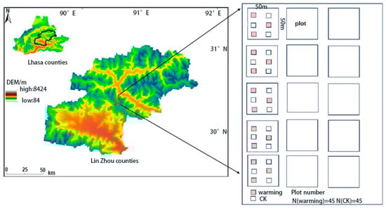 The warming experiment in this study was conducted in Bailang Village, Kazi Township, Lhasa City, China (29°59′ N, 91°17′ E, 3900 m) (Figure 1). The area has an average annual precipitation of 390.9 mm and a mean annual air temperature of 7.9 °C [20], with an average annual evaporation of about 1440 mm. The vegetation is dominated by Pennisetum centrasiaticum, Tripogon bromoides, Kobresia pygmaea, and Carex atrofusca [21]. This region is characterized by a typical plateau temperate semi-arid climate, with dry and cool conditions, abundant sunlight, long and cold winters, and short and cool summers [22].