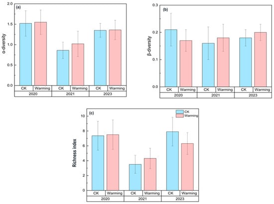 Changes in the α-diversity, richness index, and β-diversity under control (CK) and warming conditions in 2020, 2021, and 2023. (a) α-diversity (Shannon index); (b) β-diversity (turnover); (c) richness index. The blue bars represent the control group, and the pink bars represent the warming group. Each bar is accompanied by error bars, indicating the standard error (SE).