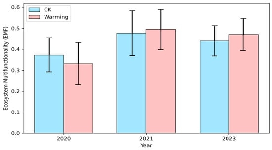 The single-threshold analysis showed that the number of functions exceeding the threshold generally decreased with lower species richness in both treatments (Figure 3a,c). This negative relationship was stronger under warming treatment, indicating that multifunctionality was more sensitive to species loss when temperature increased. The multi-threshold analysis further revealed that the diversity–multifunctionality relationship depended strongly on the threshold level (Figure 3b,d). At low thresholds, slopes were close to zero, meaning most functions easily met the threshold regardless of diversity. At intermediate thresholds (around 50–70%), slopes were most negative, showing that biodiversity had its strongest effect on sustaining multifunctionality. At high thresholds (>80%), slopes increased again, forming a clear bimodal pattern. This bimodal pattern was more pronounced under warming, suggesting that warming enhances the threshold sensitivity of multifunctionality and reduces functional stability at medium–high performance levels. The mean-based analysis of nine ecosystem function indicators showed that mean EMF increased from 2020 to 2021 and declined slightly in 2023 in both treatments. Although warming tended to show higher mean EMF values in 2021 and 2023, the overlap of SD bars indicates that warming did not result in a statistically significant difference in average EMF (Figure 4).