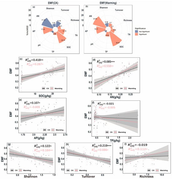 In the control group, available nitrogen, available phosphorus, and soil organic carbon were the three most influential factors on EMF, with relative importance values of 21.22%, 17.25%, and 20.74%, respectively (Figure 6a), with available phosphorus and soil organic carbon showing significant driving effects. In contrast, in the warming group, this driving pattern changed significantly: the importance of available nitrogen, increased to 23.95%, becoming a significant driving factor, while the influence of soil organic carbon also significantly increased to 26.87% (Figure 6b), and both factors jointly became the most critical drivers of EMF. After warming treatment, the driving effects of various physicochemical factors on EMF generally increased, whereas the driving effects the control group were relatively weak and the factors were more widely distributed (Figure 6a,b). Further analysis revealed that under different treatment conditions, EMF showed significant positive linear correlations with soil organic carbon, total nitrogen, and available nitrogen (p < 0.01; Figure 6c–f). EMF exhibited a significant negative linear relationship with α-diversity (p < 0.01; Figure 6g), but no significant correlation with β-diversity (p > 0.05; Figure 6h). All significant relationships in the warming group showed higher coefficients of determination (R2), indicating that their correlation strengths were generally stronger than those the control group.