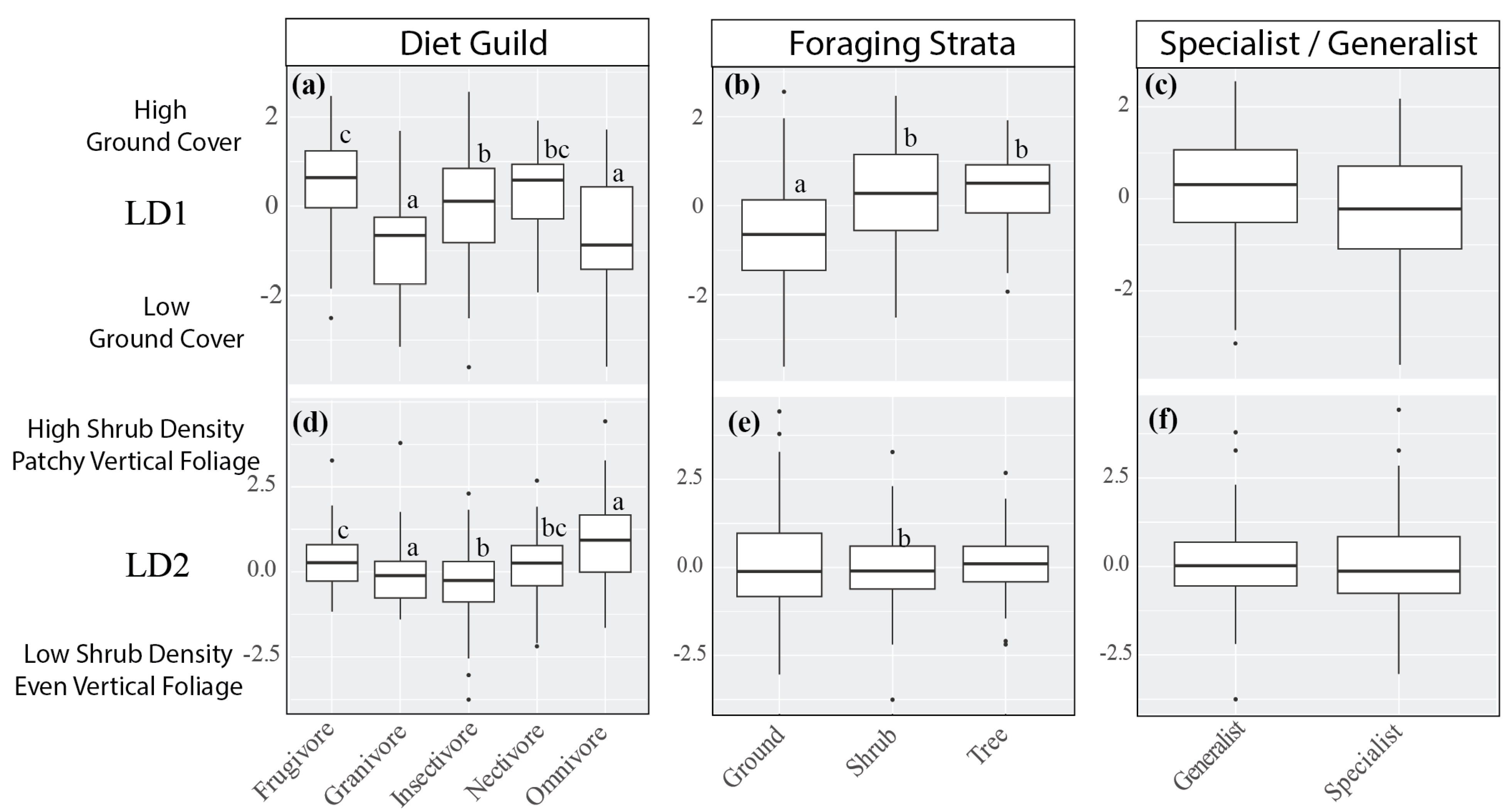 3.2. Effect of Diet Guild, Foraging Strata, and Specialist/Generalist Species