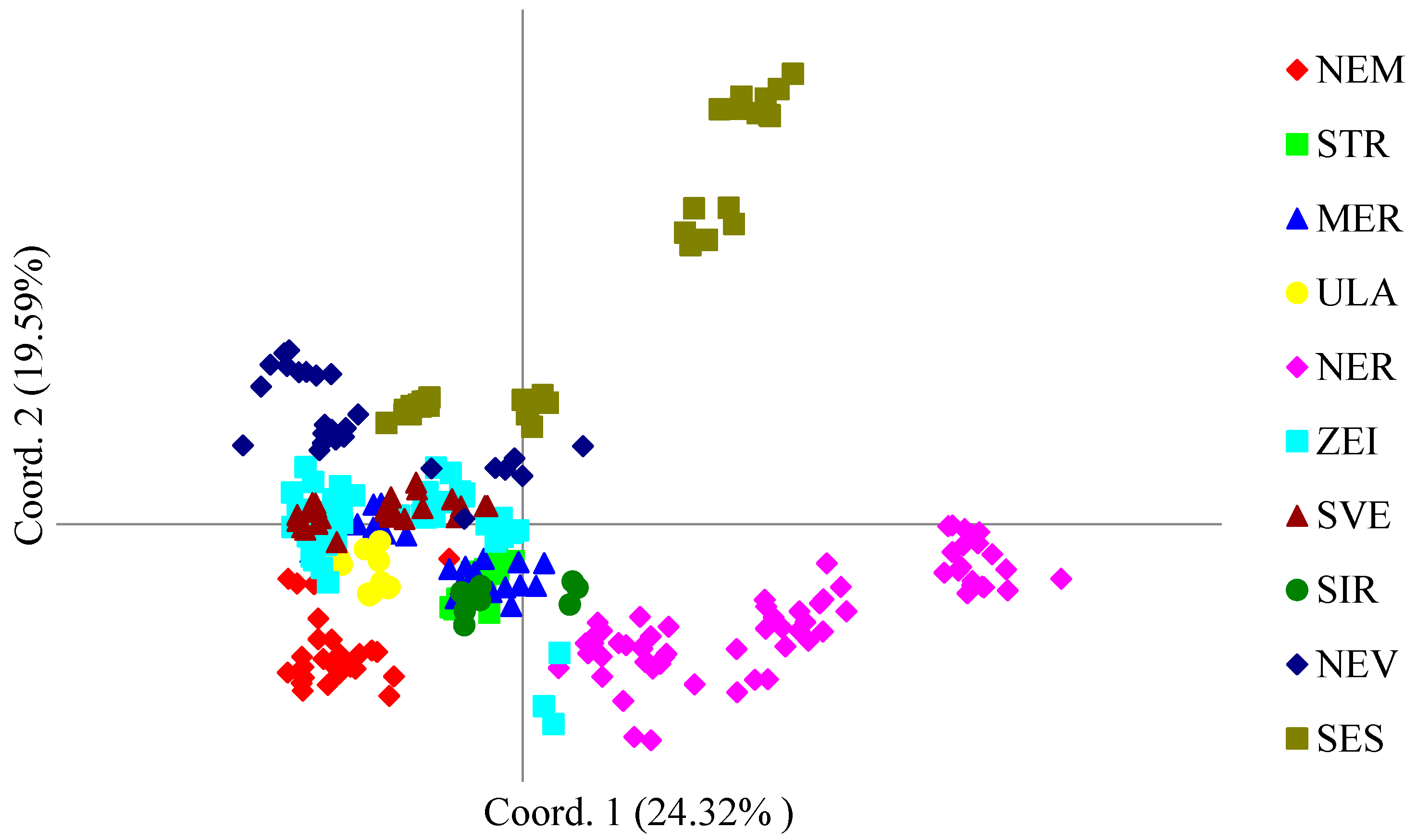 - Peakall, R.; Smouse, P.E. GenAlEx 6.5: Genetic analysis in Excel. Population genetic software for teaching and research—An update. Bioinformatics 2012, 28, 2537–2539. [Google Scholar] [CrossRef]