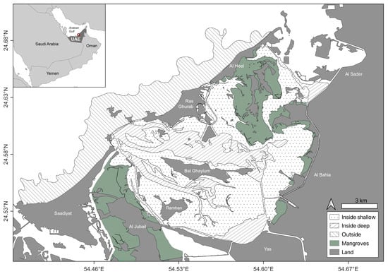 Study area in the Khor Faridah region on the eastern side of Abu Dhabi (United Arab Emirates). Sampling strata are illustrated according to pattern.