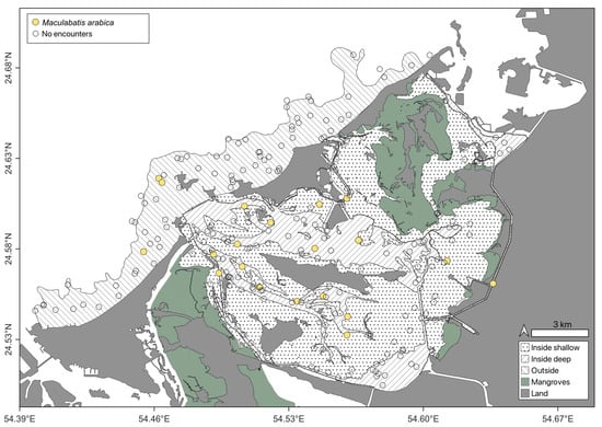 The most commonly encountered taxon during this study was Himantura but, unfortunately, it was not possible to identify these individuals to species. Previous surveys within the study area have confirmed the presence of both H. leoparda and H. uarnak [29]; therefore, it is highly likely that the observations included these two species. Further dedicated studies are needed to investigate the relative abundance of H. leoparda and H. uarnak in U.A.E. waters. However, it is essential that any such efforts include molecular data, as colour patterns are not a reliable differentiator of these species [35,37].