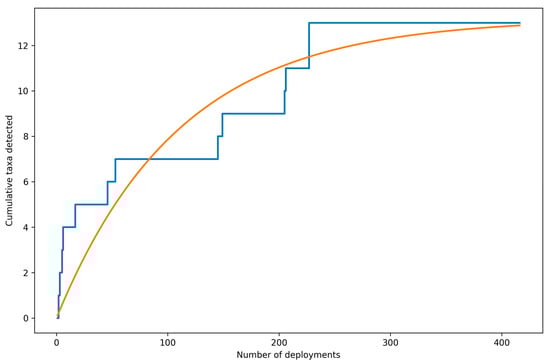 The species accumulation curve increased rapidly during early deployments and then approached an asymptote, indicating diminishing returns in additional taxa with increasing effort. Across the full dataset a total of 13 taxa were detected. All taxa had been encountered by approximately deployment 227 (≈55% of deployments), after which the curve remained flat, consistent with most taxa being detected relatively early and a small number of rare taxa requiring additional sampling to encounter (Figure 7).