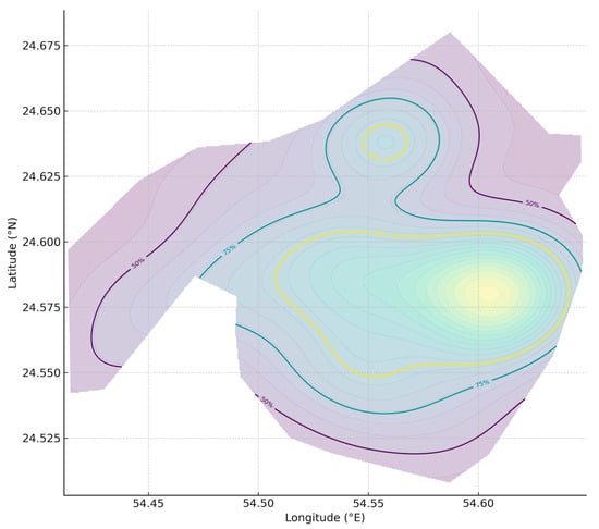 Himantura species complex utilization distribution (UD). Kernel density estimate (KDE) of OPUE (individuals per hour) for Himantura species complex across the Khor Faridah, Abu Dhabi, United Arab Emirates, shown as 50%, 75%, and 95% utilization isopleths. Density reflects relative encounter intensity, not absolute counts.