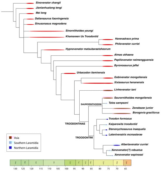 - Wang, S.; Ding, N.; Tan, Q.; Yang, R.; Zhang, Q.; Tan, L. A new Urbacodon (Theropoda, Troodontidae) from the Upper Cretaceous Iren Dabasu Formation, China: Implications for troodontid phylogeny and tooth biology. Cladistics 2025, 41, 104–134. [Google Scholar] [CrossRef] [PubMed]
