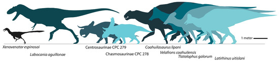- Voris, J.T.; Therrien, F.; Zelenitsky, D.K.; Brown, C.M. A new tyrannosaurine (Theropoda: Tyrannosauridae) from the Campanian Foremost Formation of Alberta, Canada, provides insight into the evolution and biogeography of tyrannosaurids. Cretac. Res. 2020, 110, 104388. [Google Scholar] [CrossRef]