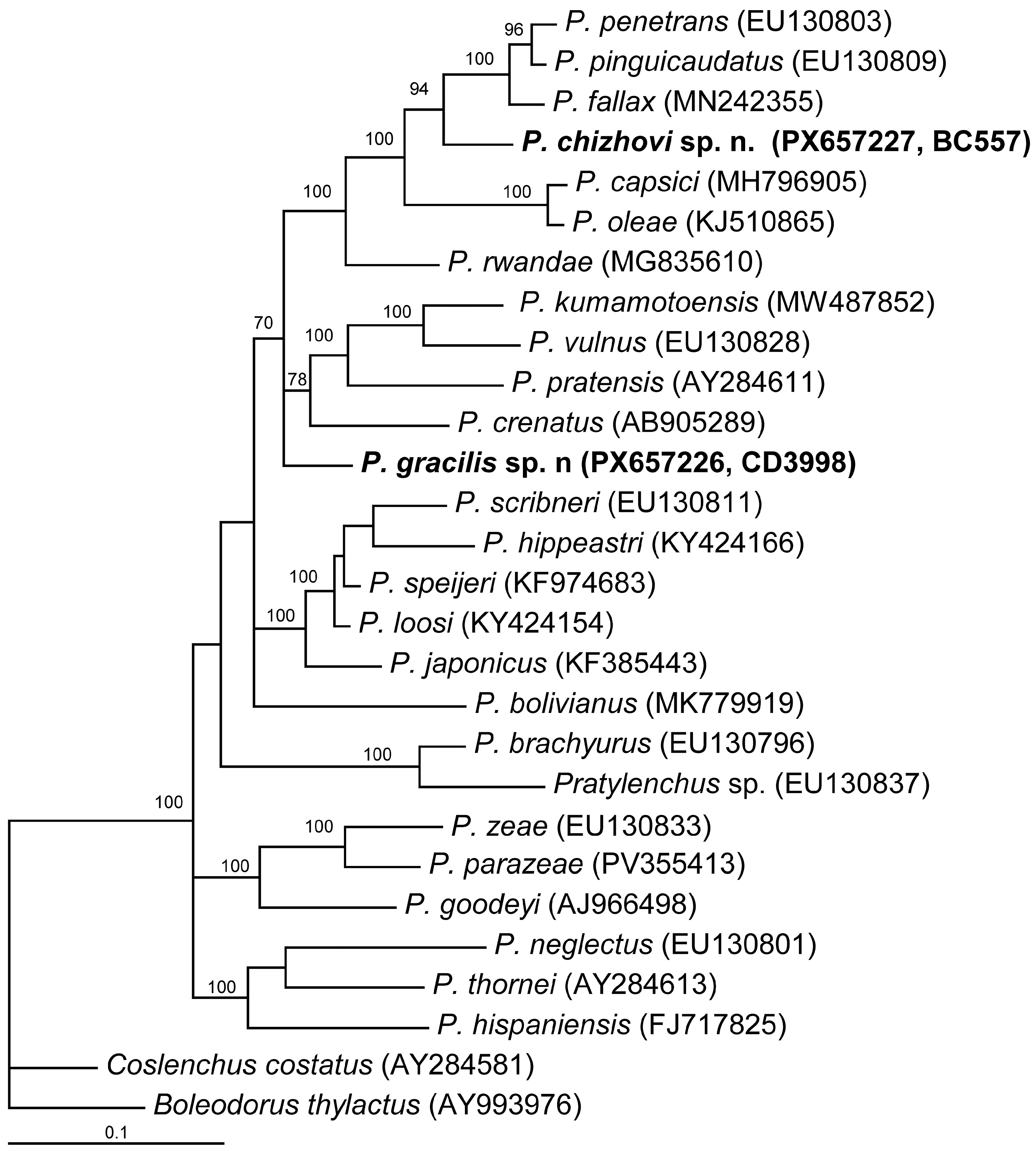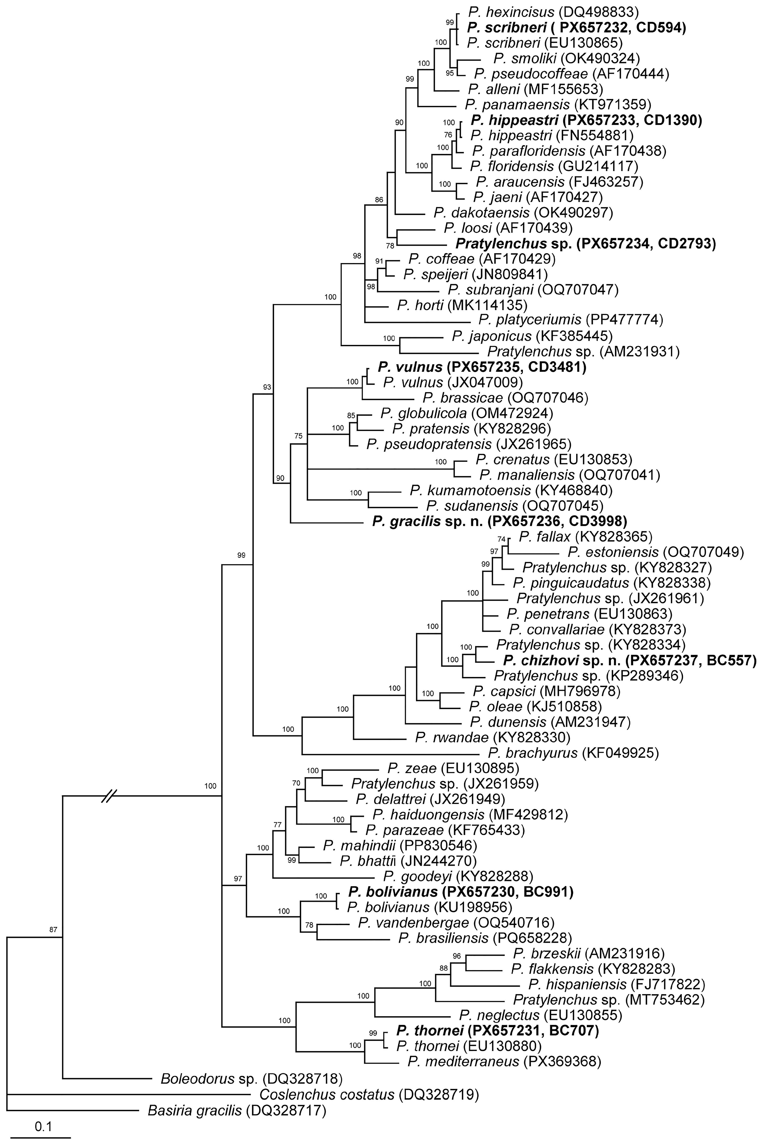 Diversity of Plant-Parasitic Nematodes of the Genus Pratylenchus (Nematoda: Pratylenchidae) in California: Descriptions of Two New Species and Insights from Phylogenetic Analyses †
