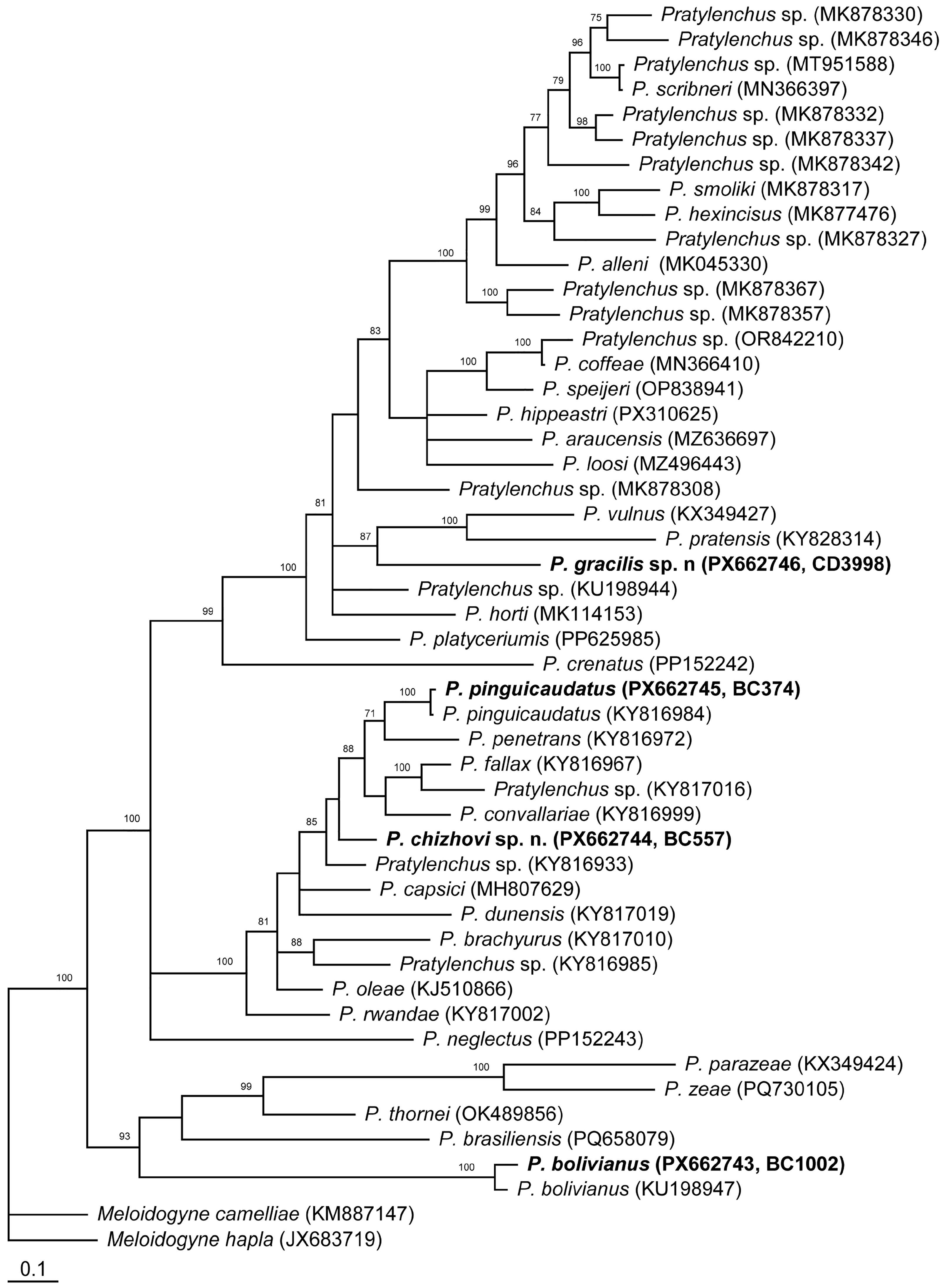 - Du, Y.; Li, M.; Zhou, J.; Yang, Y.; Zhong, J.; Yang, J.; Gu, J. Description of Pratylenchus platyceriumis sp. n. from the root and rhizosphere of Platycerium seedlings from Thailand. Nematology 2024, 26, 909–927. [Google Scholar] [CrossRef]