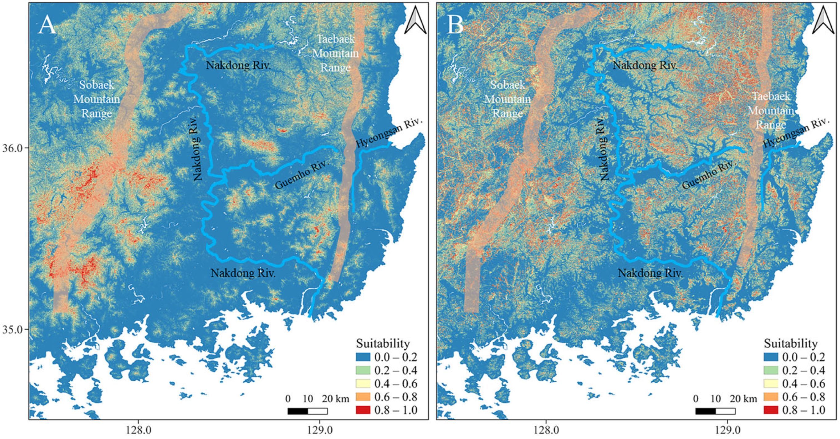 - Peng, Y.; Li, Y.; Cao, G.; Li, H.; Shin, Y.; Piao, Z.; Perez, F.; Zhu, W.; Borzée, A. Estimation of habitat suitability and landscape connectivity for Liaoning and Jilin clawed salamanders (Hynobiidae: Onychodactylus) in the transboundary region between the People’s Republic of China and the Democratic People’s Republic of Korea. Glob. Ecol. Conserv. 2023, 48, e02694. [Google Scholar] [CrossRef]