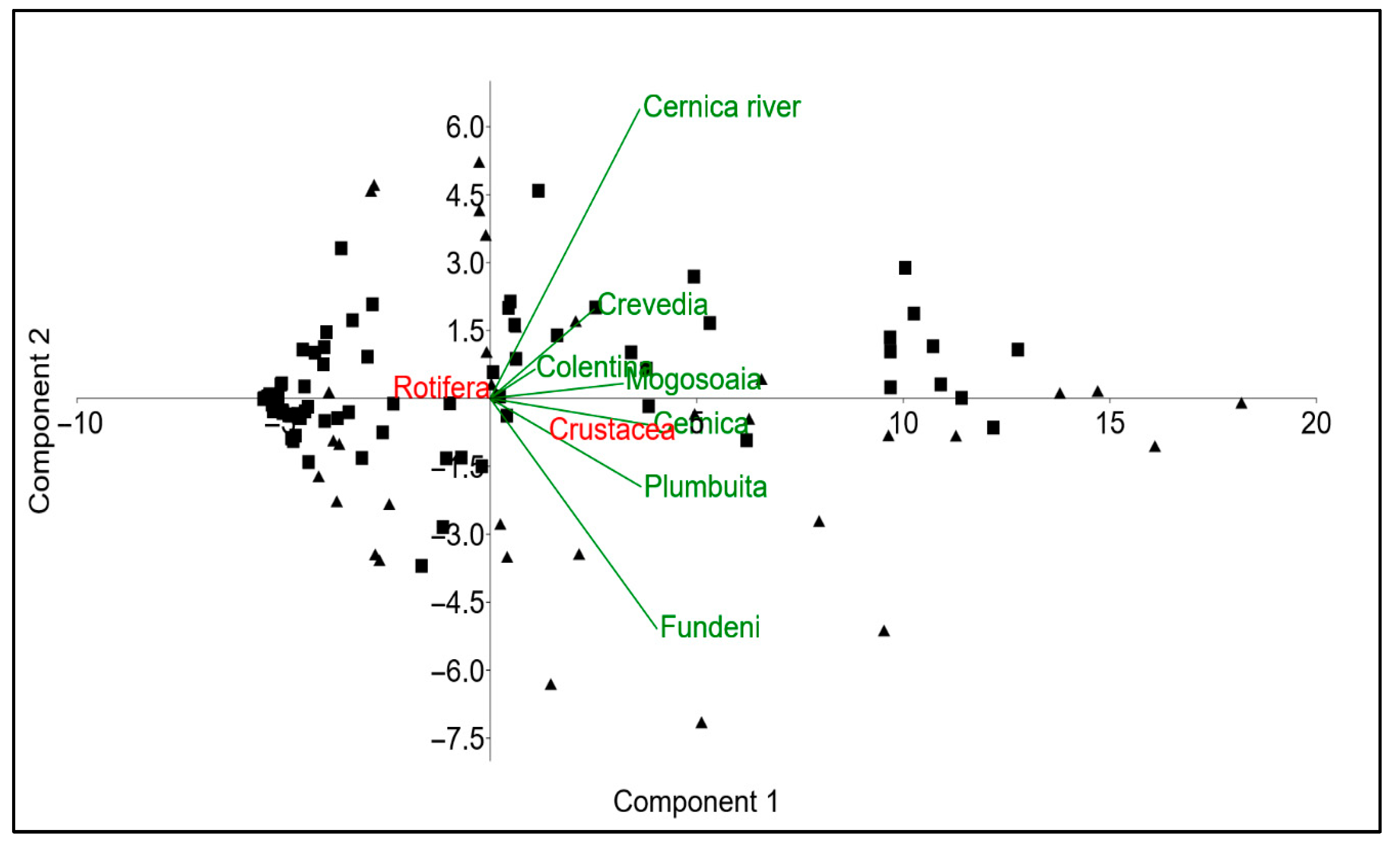Thus, the Colentina River crosses areas with different characteristics: unmodified riverine areas influenced by rural areas, followed by peri-urban and urban areas with lakes, which provide an ideal framework for assessing anthropogenic impacts along a spatial gradient. This diversity of local influences and hydro-morphological features allowed the assessment and comparative analysis of the effects of human activity on rotifer and crustacean communities in a spatial gradient.