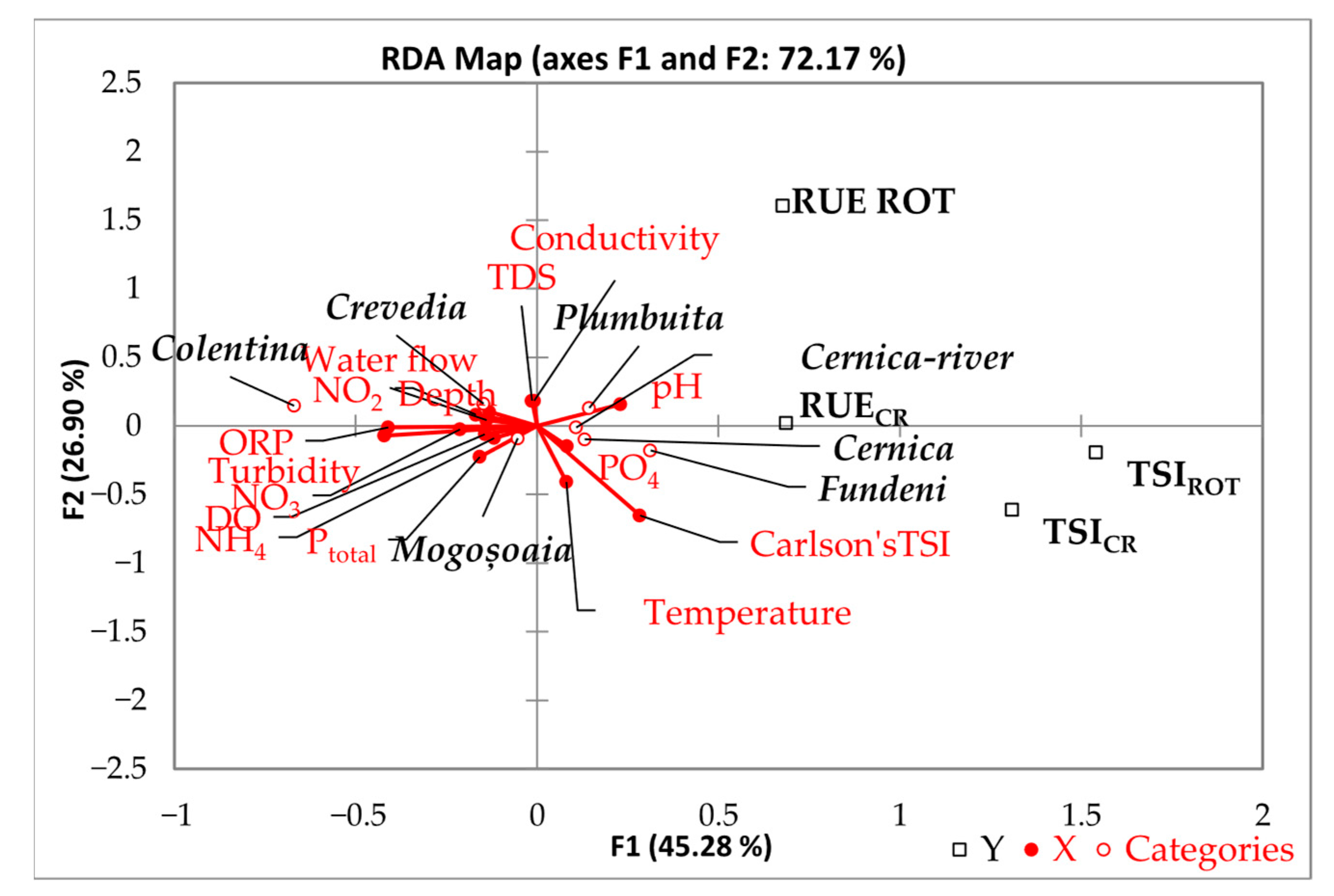 To assess the relationships between biological variables and environmental parameters that characterised the investigated areas, a Redundancy Analysis (RDA) was applied. RDA is a multivariate technique that allows the quantification of the proportion of variation in biological indices explained by the set of environmental factors included in the model. The indices TSIROT, TSICR, as well as RUEROT and RUECR, were considered response variables, and environmental factors and ecosystems were used as explanatory variables, to identify the degree to which these predictors explain the observed biological variation. A permutation test was used to assess the significance of the models and canonical axes [40].