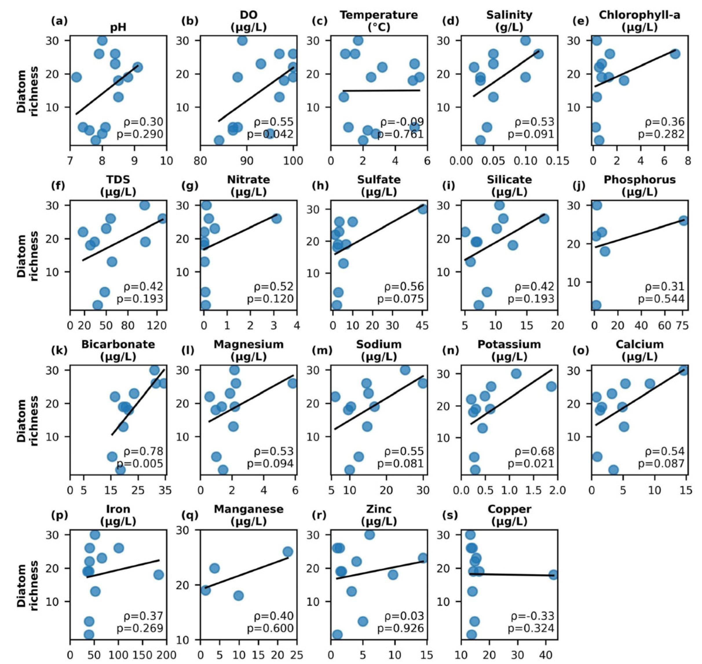 | Sites | pH | DO (%) | Tem. (°C) | Con. (μS cm−1) | Salin. (g/L) | TDS (mg L−1) | Chl-a (µg L−1) | ORP (mV) | Key Nutrients (µg/L) | Key Ions (µg/L) | Key Metals (µg/L) | Diatom Species Richness |