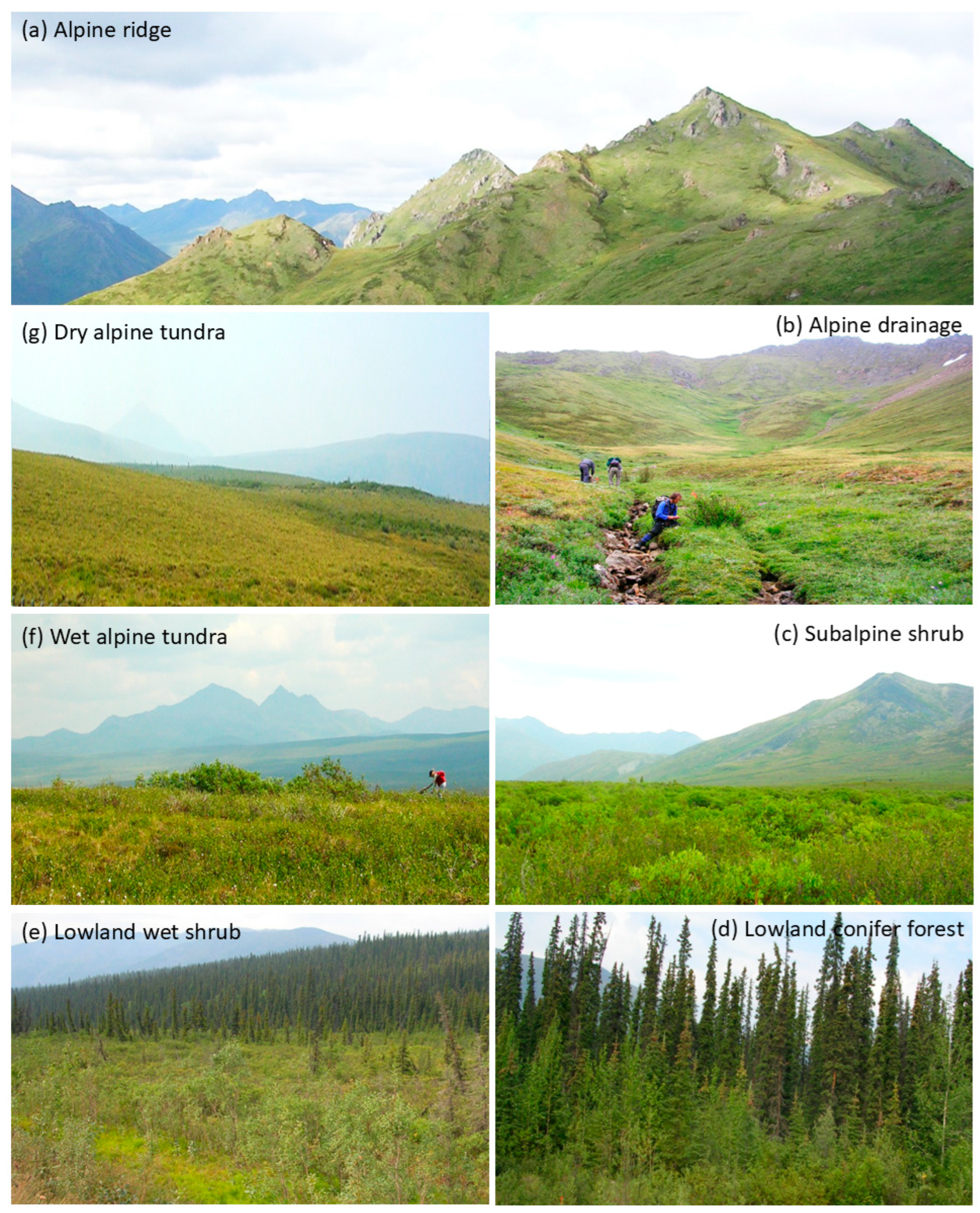 - Environment Yukon. Bioclimate Zones and Subzones; Government of Yukon: Whitehorse, YT, Canada, 2021. [Google Scholar]
