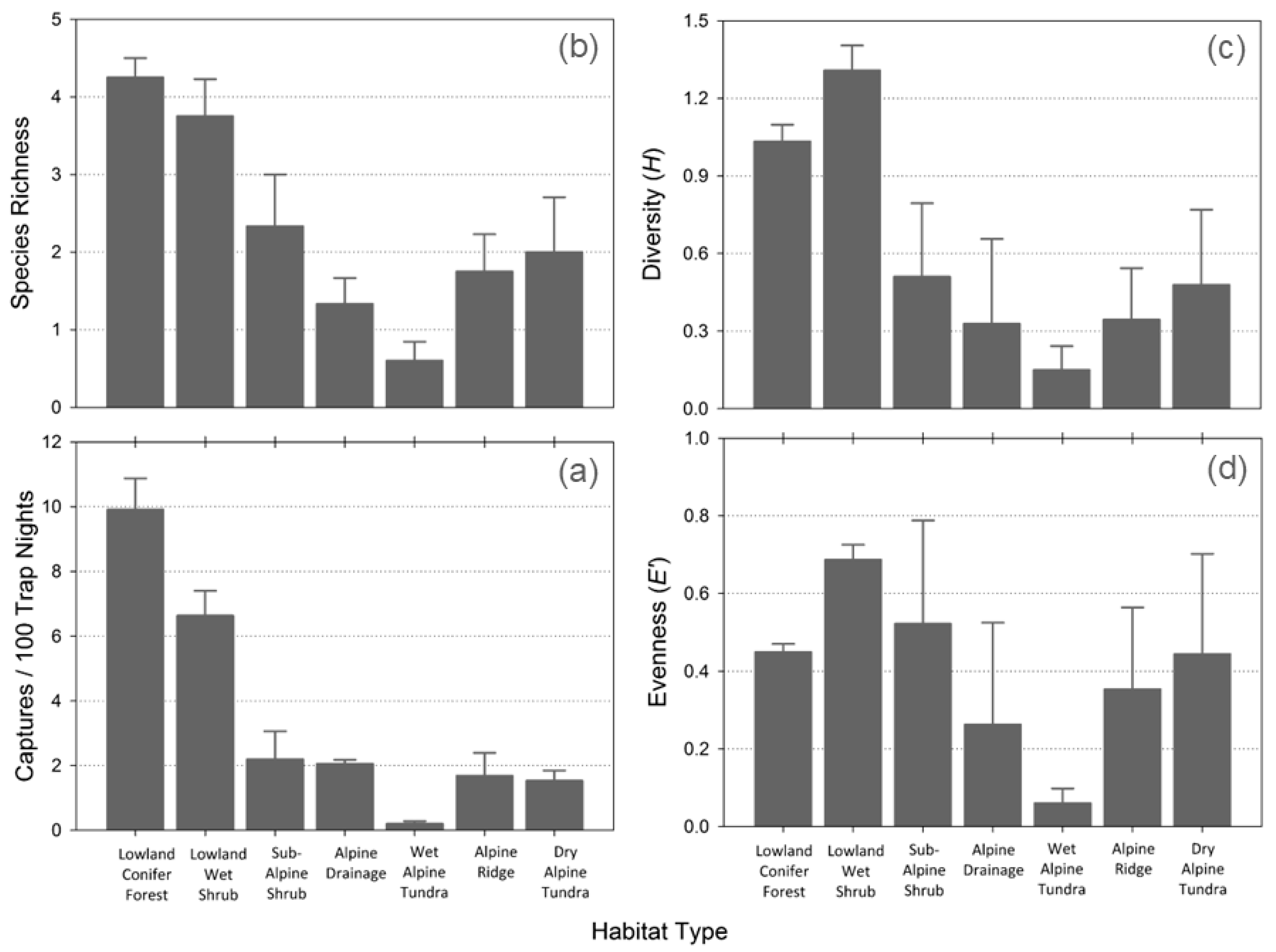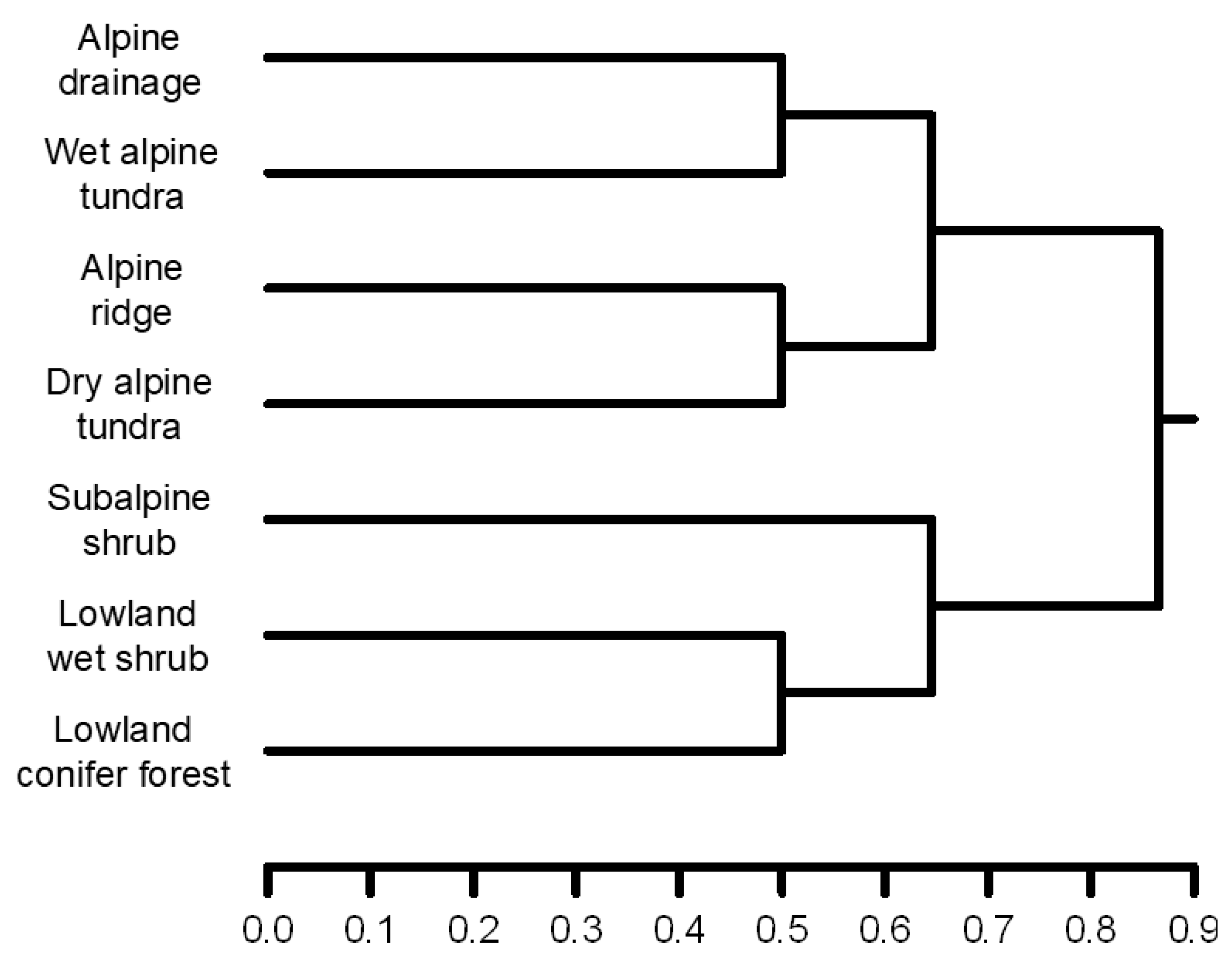 | Species and Richness | Lowland Conifer Forest | Lowland Wet Shrub | Subalpine Shrub | Alpine Ridge | Alpine Drainage | Wet Alpine Tundra | Dry Alpine Tundra | H | p | Levin’s Niche Breadth |