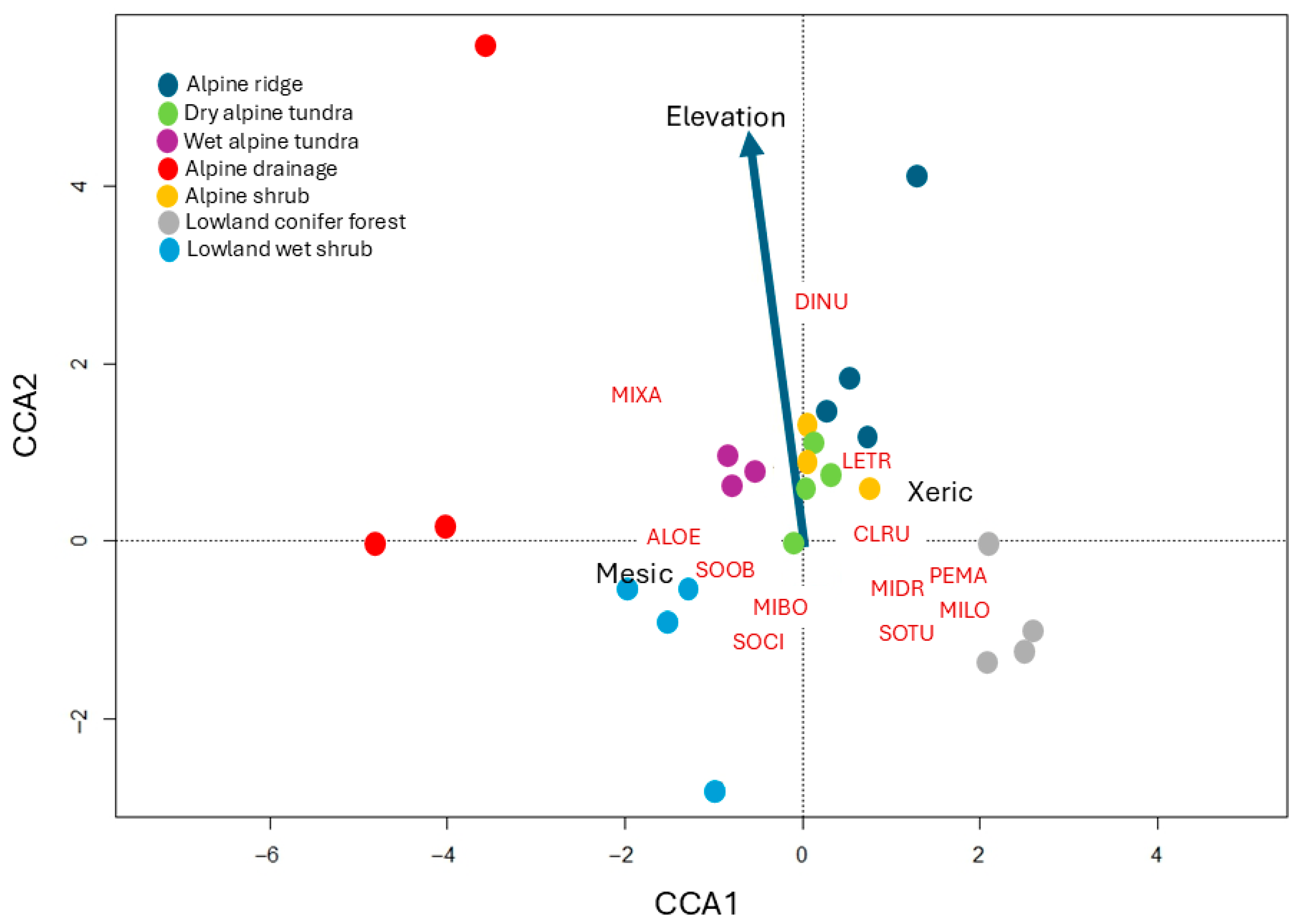 | Habitat Type | Lowland Conifer Forest | Lowland Wet Shrub | Subalpine Shrub | Alpine Ridge | Wet Alpine Tundra | Dry Alpine Tundra | Alpine Drainage |